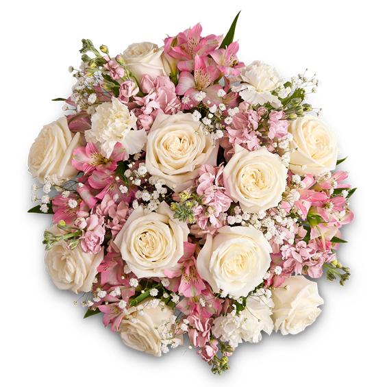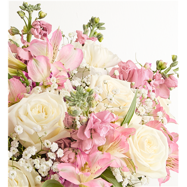 All-around arrangement with white roses and carnations, pink Peruvian lilies (alstroemeria) and stock; accented with baby’s breath and assorted greenery